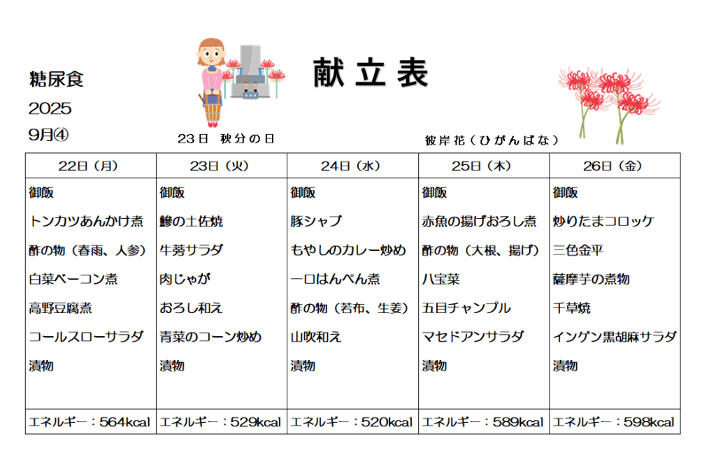 今週のランチメニュー(糖尿食)【2025.9.22(月)~2025.9.26(金)】