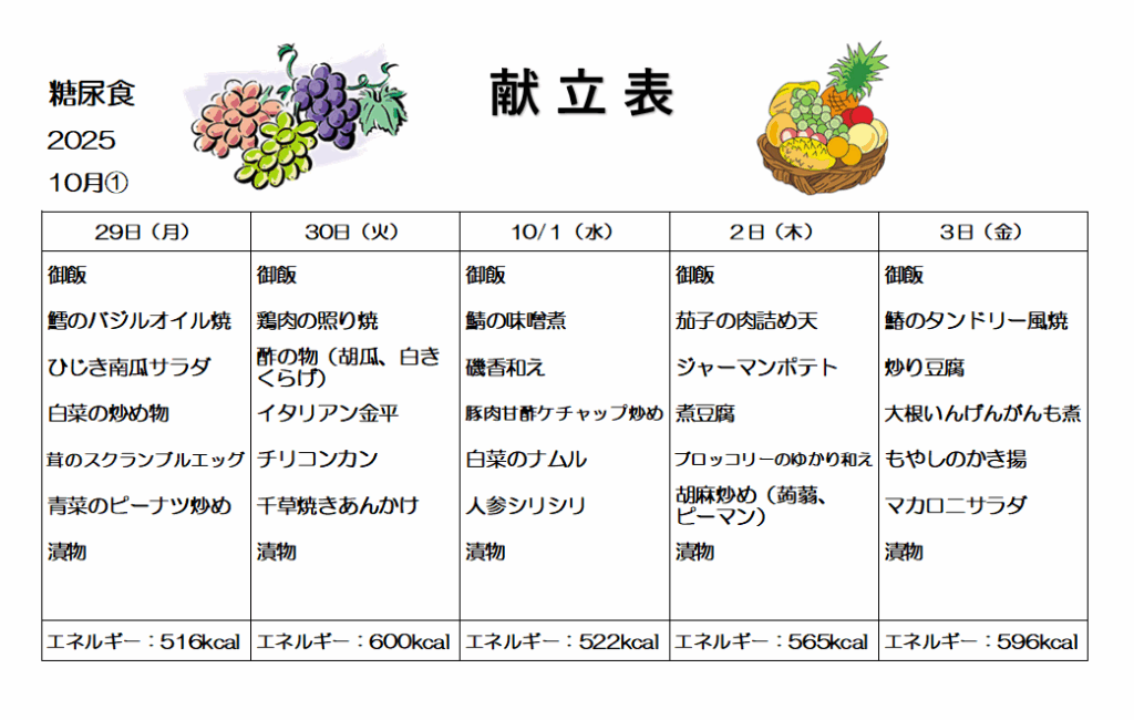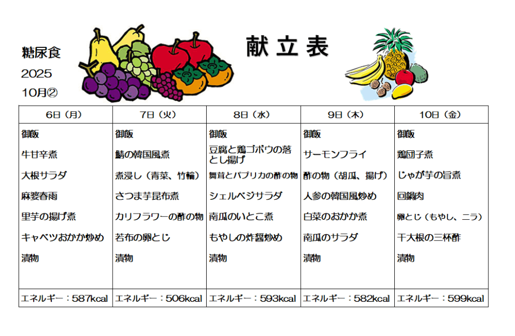 今週のランチメニュー(糖尿食)【2025.10.6(月)~2025.10.10(金)】