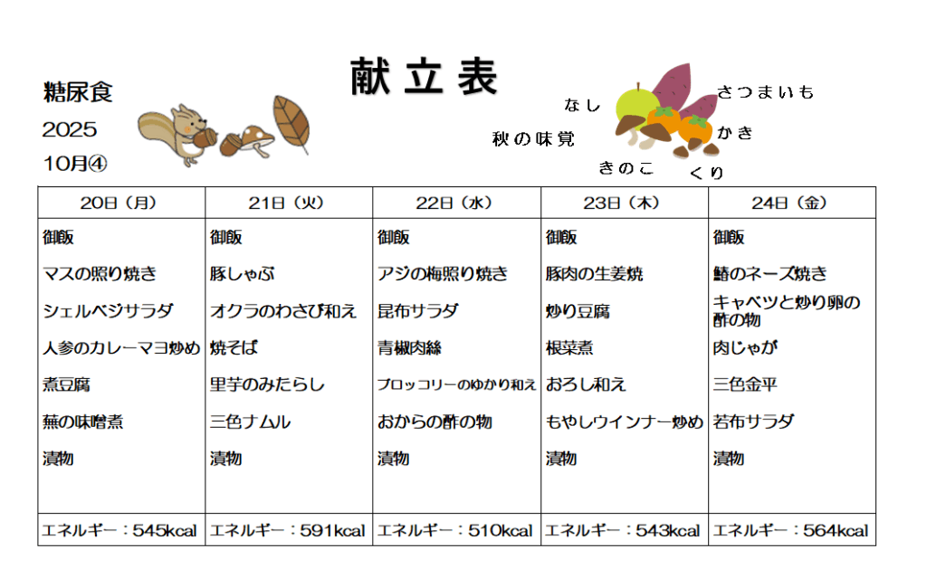 今週のランチメニュー(糖尿食)【2025.10.20(月)~2025.10.24(金)】