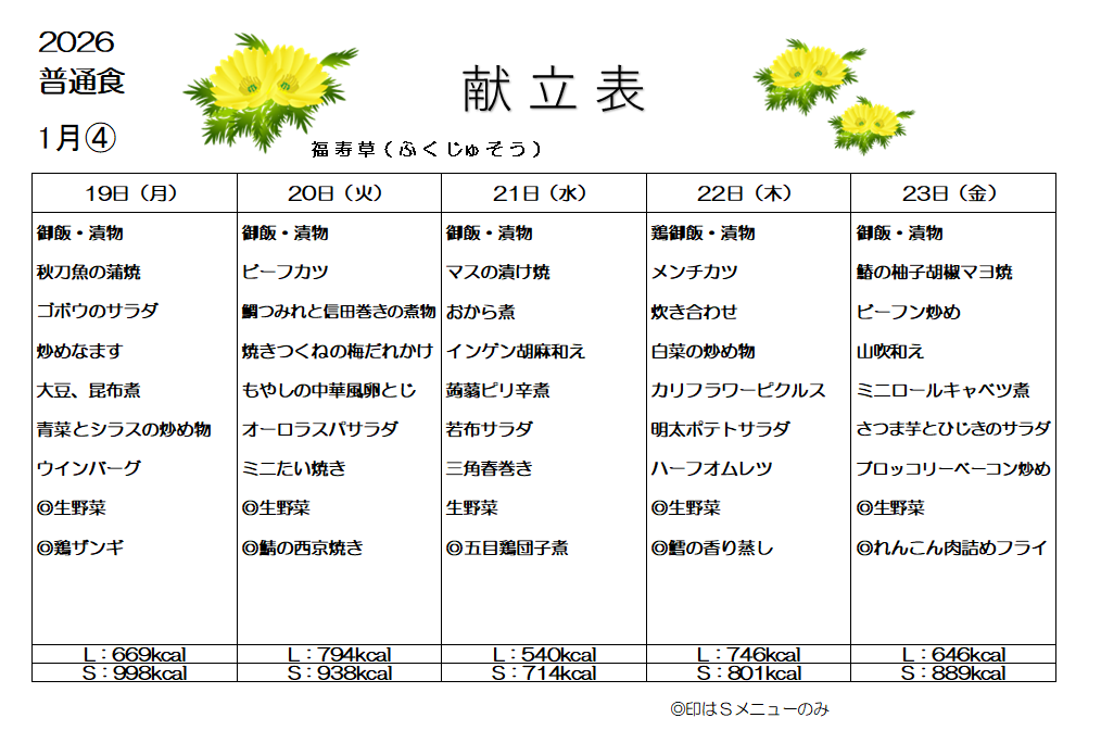 今週のランチメニュー(普通食)【2026.1.19(月)~2026.1.23(金)】