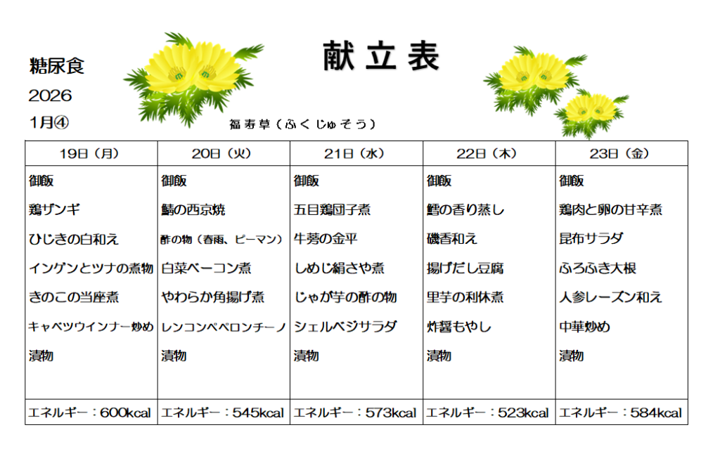 今週のランチメニュー(糖尿食)【2026.1.19(月)~2026.1.23(金)】